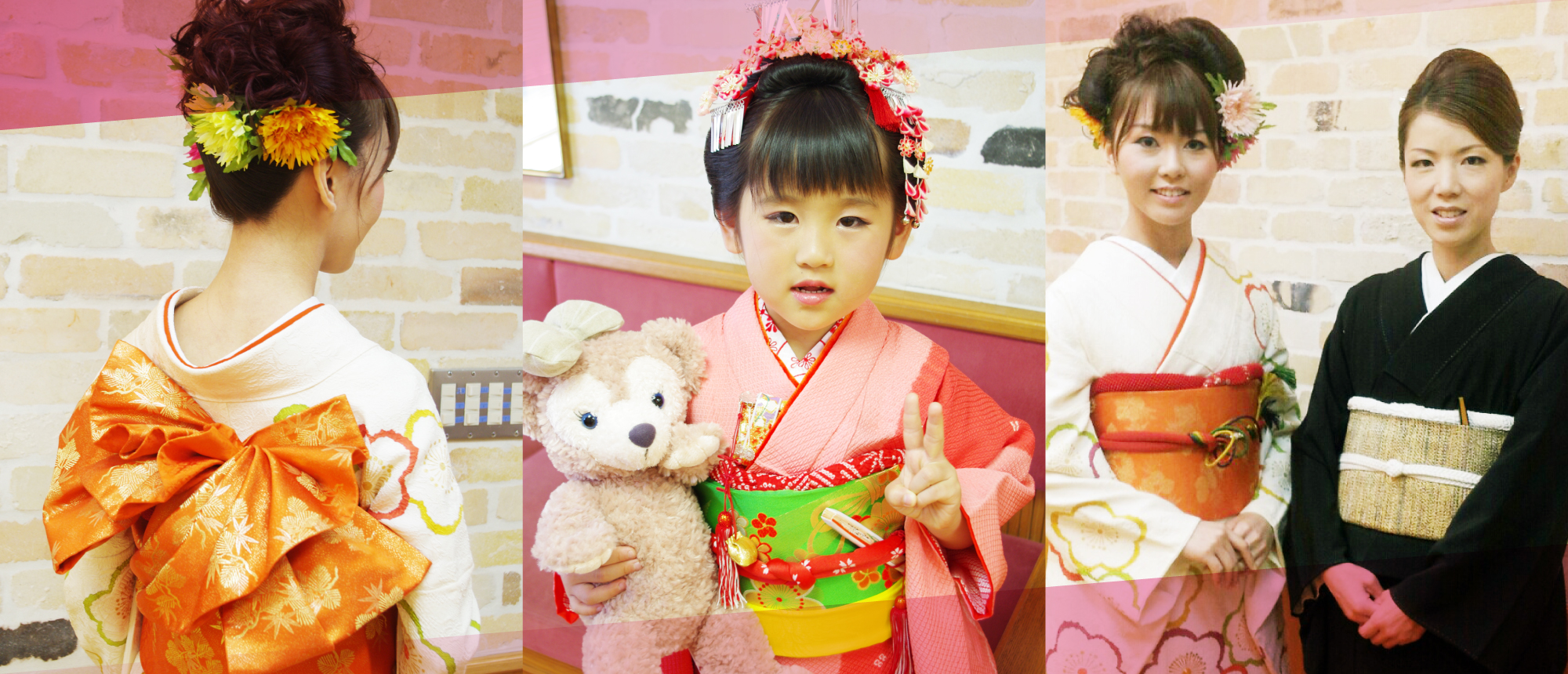 結婚式での和装や成人式、卒業式での振袖から、浴衣でのお出かけなどの際にもご利用いただいております。これまで着物を着たことがない方や、一度着てみたいがどこで相談したらよいかわからない方も、お気軽にご相談ください。